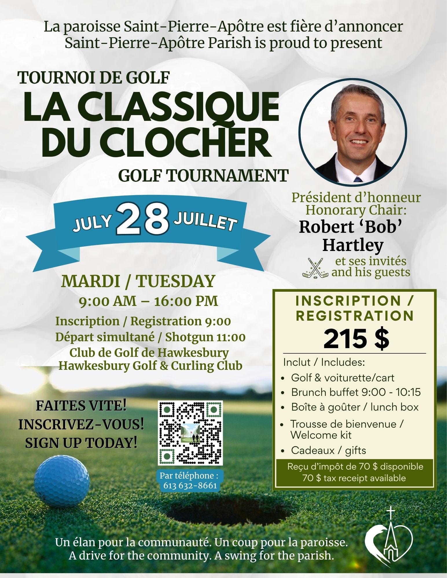 C’est officiel! Les inscriptions sont maintenant lancées pour le tout premier Tournoi de golf de la paroisse Saint-Pierre-Apôtre La Classique du Clocher, le mardi 28 juillet 2026, au Club de golf de Hawkesbury, 1150 chemin du Golf. Une journée mémorable vous attend, en compagnie de notre président d’honneur Robert “Bob” Hartley, et ce, pour une excellente cause au cœur de notre communauté. L’inscription est 215 $ par personne, ce qui inclut :